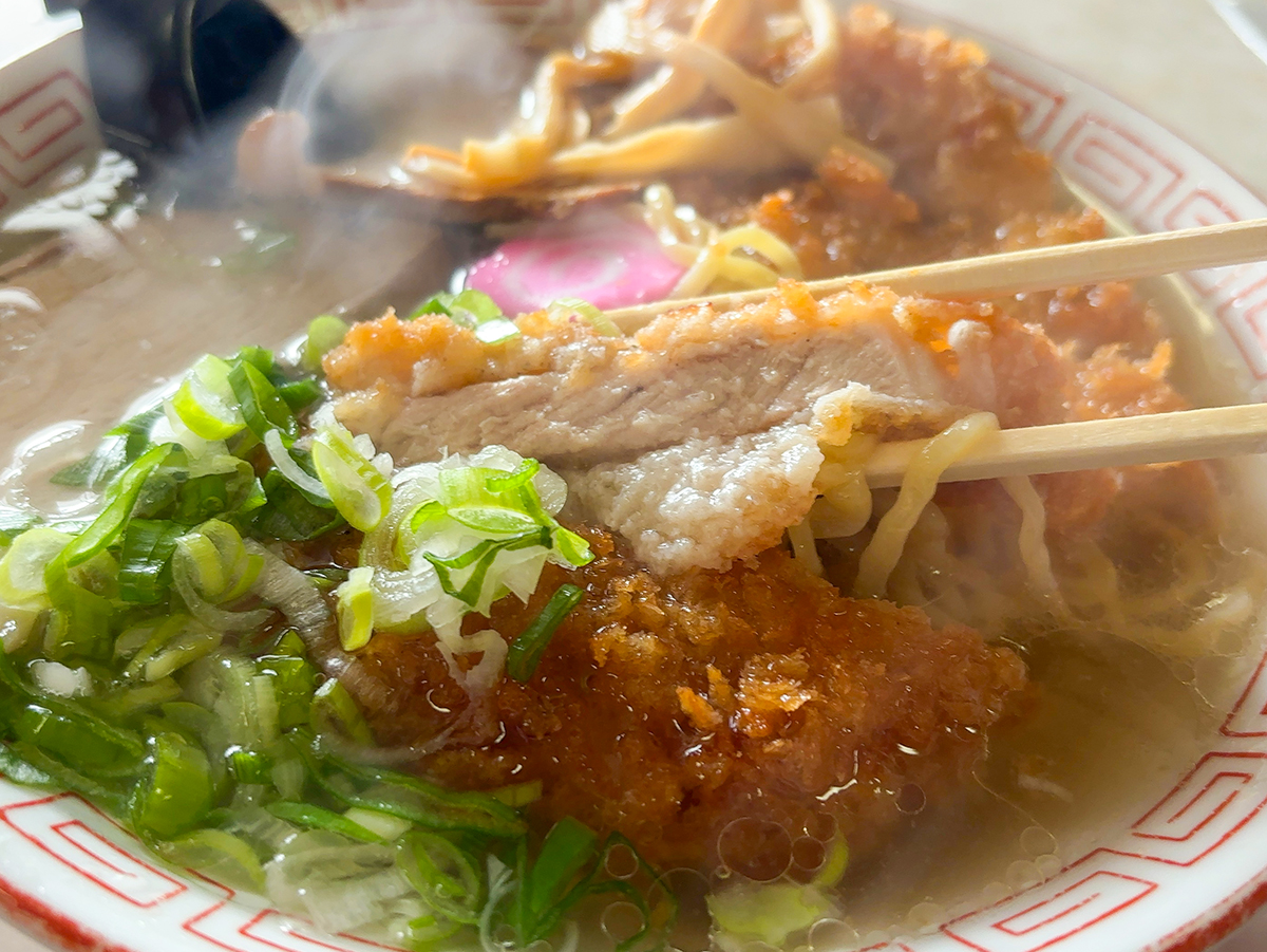 旨旨塩スープにカツの脂がにじみ出て、サイコーです