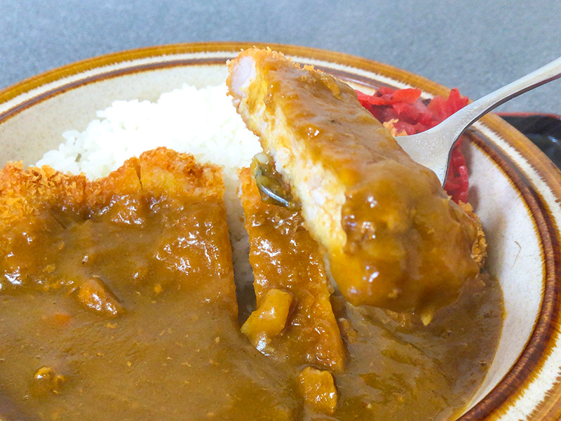 トンカツは衣がしっかりついています。心地よい噛みごたえをのこしつつもスプーンで容易にカットできる柔らかさ