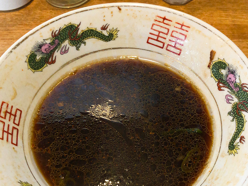 真っ黒いスープは味が濃くしょっぱめ。脂もしっかりです。ニンニキー🧄で豚骨の旨みがよ〜く出ているスープ。