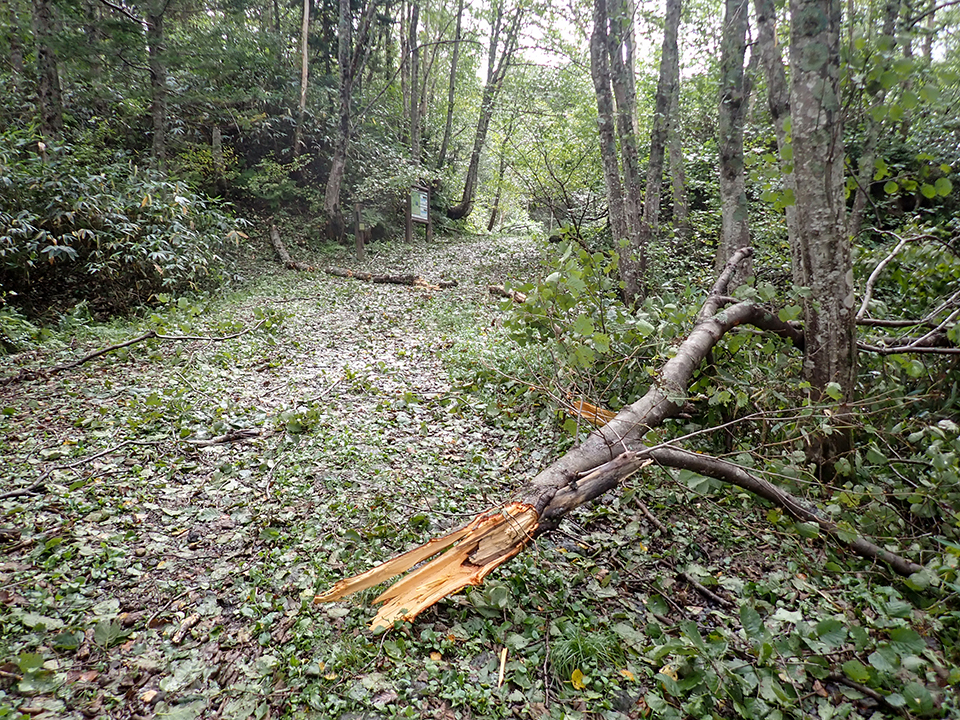 9/20夜から21日にかけての暴風雨の影響で倒木や折れた枝が目立ちます。木の葉も紅葉前に散ってしまいました...