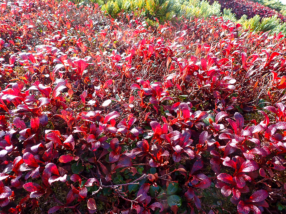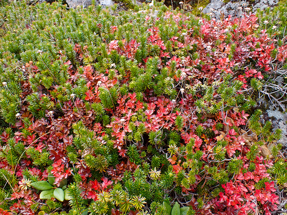 紅葉したチングルマの葉と、濃い緑色のエゾノツガザクラの葉。