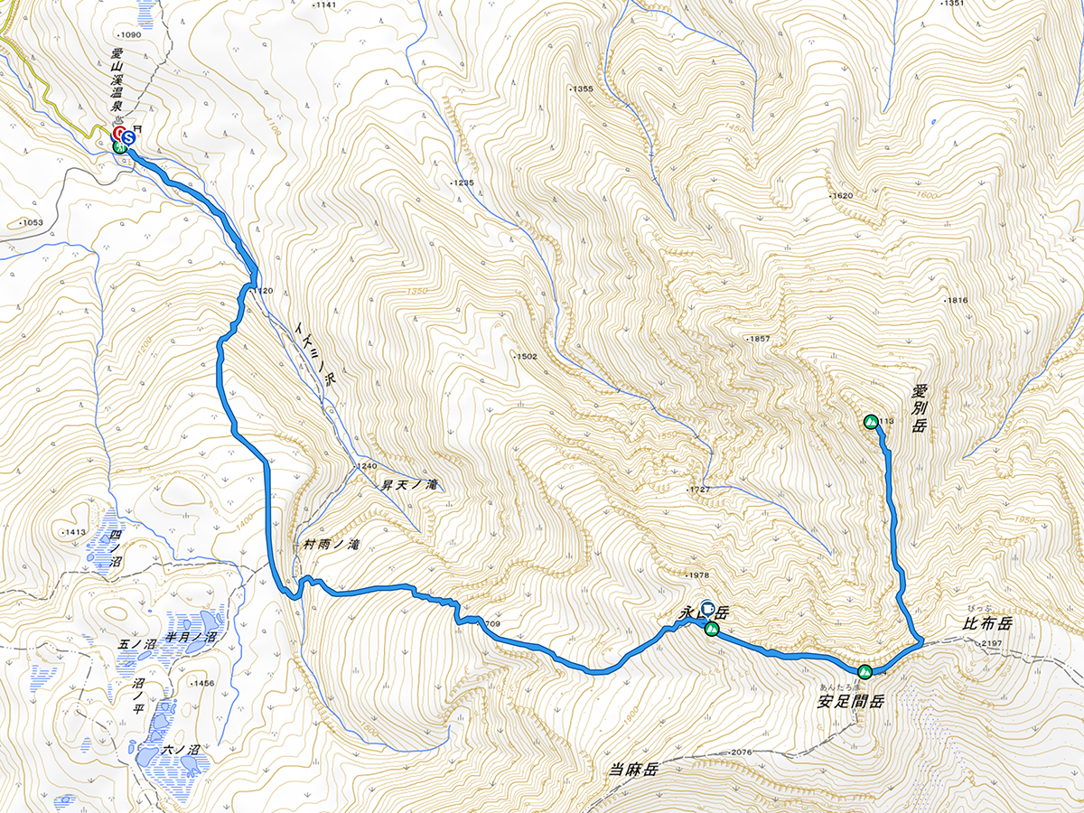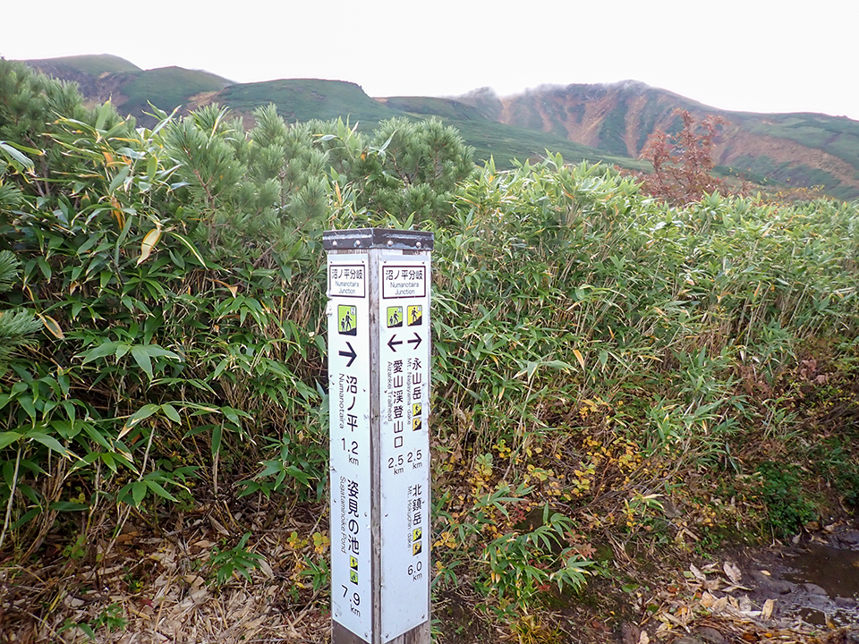 愛山渓温泉からスタート。まずは三十三曲分岐、沼ノ平分岐を経て永山岳へ。ここまでで3時間半弱!(長い!)