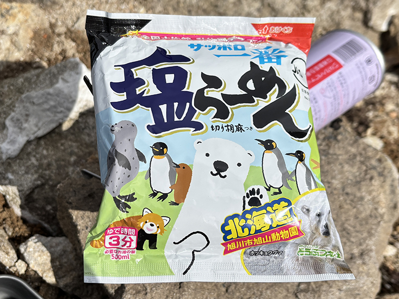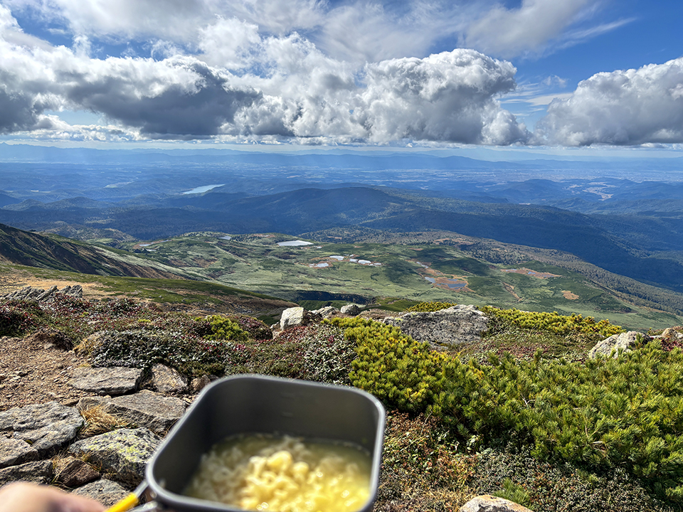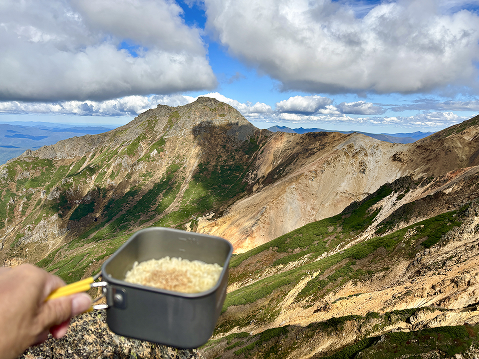 念願の愛別岳登頂を果たし、その峰を見ながら啜る山ラーの美味さよ