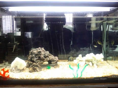 水草はアナカリスとアマゾンソード。初心者向けの草です。興味深い形の水草はいろいろあったけど、日中も照明をつけておかないとならないとか、CO2を添加しなきゃならないなど色々費用がかかりそうだったもんで手間と費用のかからなさそうなのを選びました。