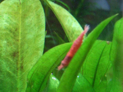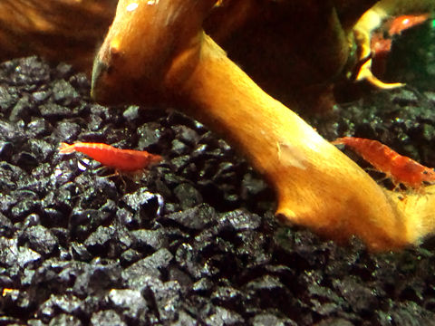 ファイヤーレッドシュリンプ(レッドファイヤーシュリンプとも)が10匹。体長は3cmほど。赤いです。かっぱえびせんのパッケージのエビのように。レッドチェリーシュリンプの中で特に赤い個体を掛け合わせて生まれたんだそうです。水草の緑に映えて美しい!