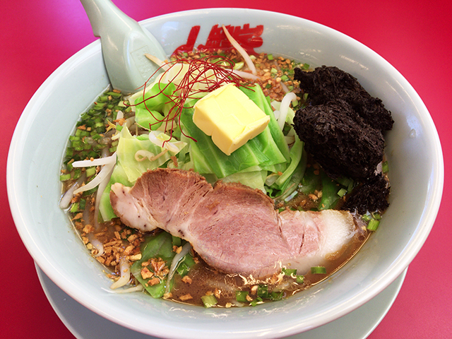 濃い〜味、ぶっとい麺、ガツンと効いたニンニク、トロッと濃厚バター、野菜どっさり。更に石炭のように固まってほぐれない黒ばら海苔。