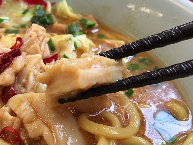 とても柔らかいので、麺と一緒に口に入れてもホルモンだけ取り残されるようなことはなく、ラーメンとの親和性が高いです。