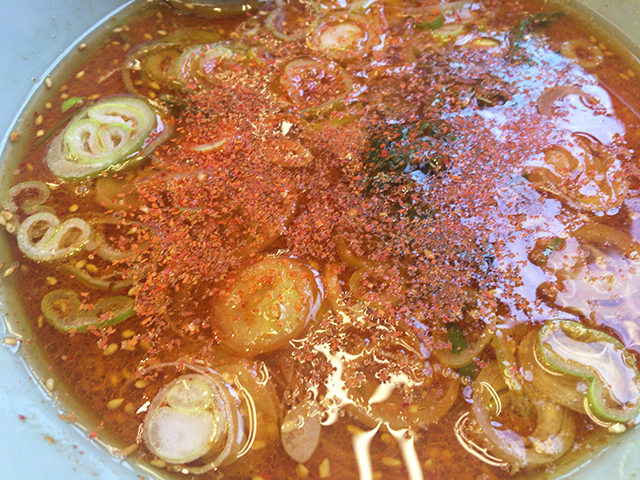 麺を食べきった後に、割りスープで割ったスープを啜ります。