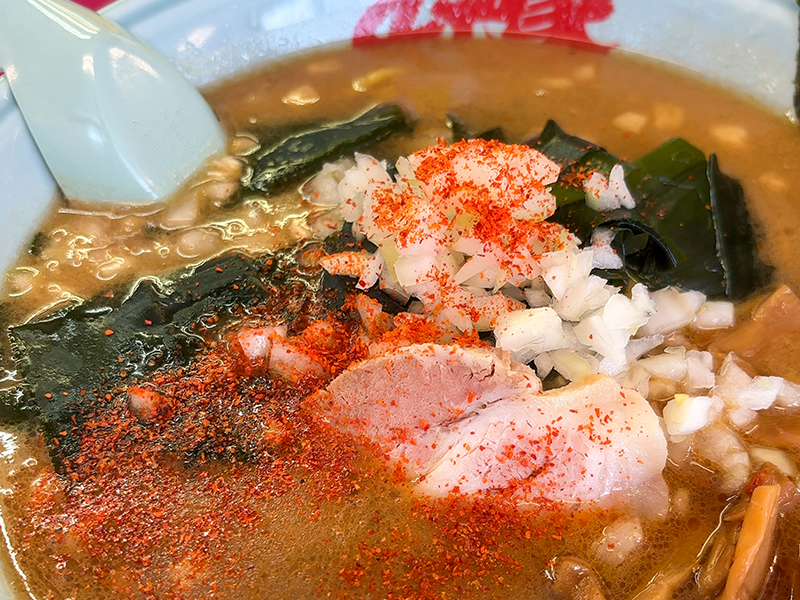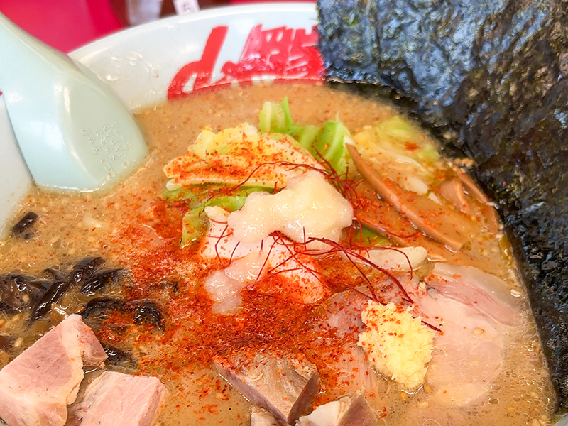 病気療養のためしばらくラーメンを食べられない、山岡家大好きなニンニク住職にエールを送るべくニンニク+一味唐辛子+豆板醤でジャンキーカスタム。
