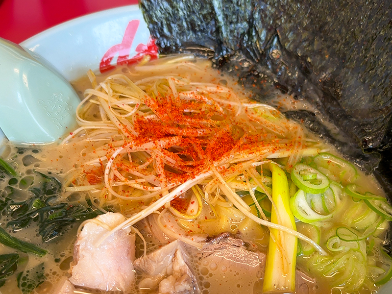 味薄め・脂少なめで、白髪ネギ(160円)とアプリクーポンのコロチャーシューと海苔をトッピングしました。