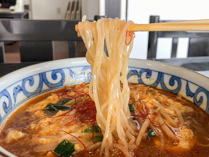 熱熱スープはあっさりながらもしっかりとしたコク。豚骨ベースにちょっと変わった風味が加わり、それがまた啜らさります